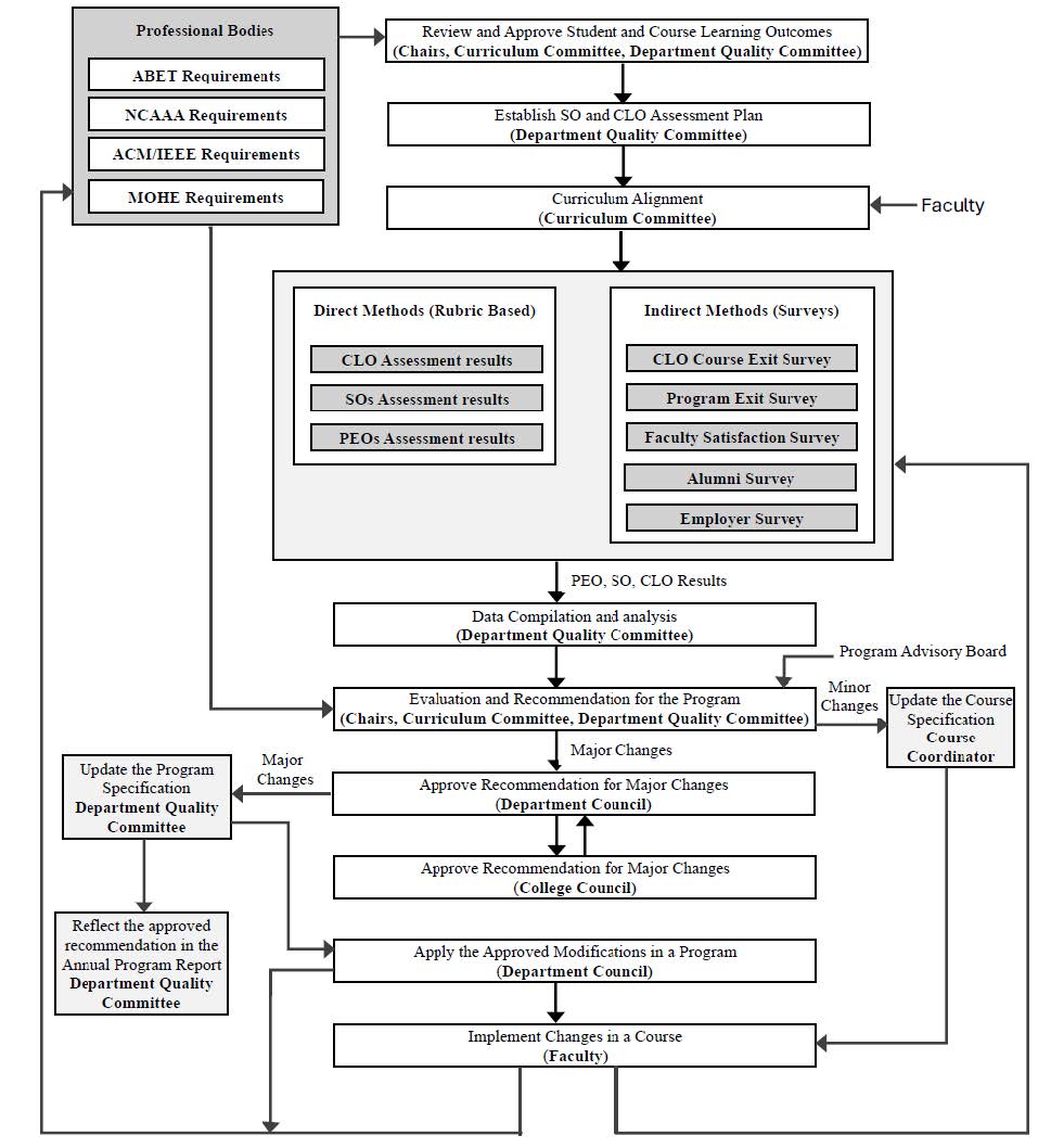 يُجسِّد إطار التقييم والتحسين المستمر المعتمد في برنامج نظم المعلومات (IS) – كما هو موضَّح في الشكل رقم (4.1) – نهجًا منظمًا وشاملًا لتقييم البرنامج. ويهدف هذا الإطار إلى دعم عمليات التقييم المستمر، والتحسين المتواصل، وضمان الاتساق مع الأهداف المؤسسية، مع الحفاظ على أعلى معايير الجودة الأكاديمية في التعليم والتعلّم. تُعد عملية تقييم البرنامج في قسم نظم المعلومات عمليةً مستمرة ومنهجية، مدمجة في منظومة الحوكمة الخاصة بالقسم، وتشمل المنهج الدراسي، وأعضاء هيئة التدريس، والمرافق، والبحث العلمي، والتطوير المهني. وانسجامًا مع إطار الجودة المؤسسي، يضمن هذا النظام أن تكون مخرجات التعلم الطلابية (SOs) محددة بوضوح، ومترابطة باستمرار مع مخرجات المقررات الدراسية، ويتم تقييمها بانتظام لدعم التميز الأكاديمي.