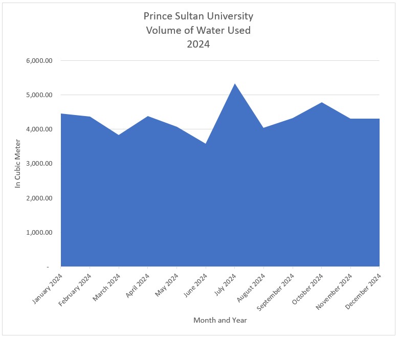 The water consumption data shows fluctuations throughout the year with some months consuming more water than others. The highest water consumption was recorded in July, with values exceeding 5,000 cubic meters. While, the lowest water consumption was recorded in June, with only 3,584.06 cubic meters used.